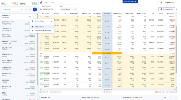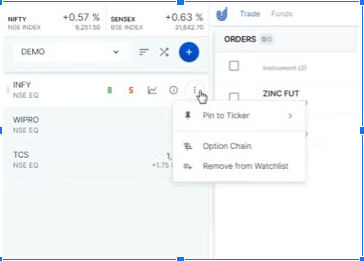 - The last button is for additional features like pinning that scrip to the watch list, to view the detailed option chain for the scrip’s option contracts.