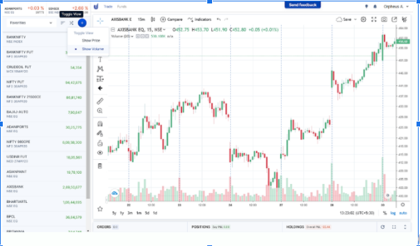 With the Toggle View feature in Upstox Pro Web 3.0, traders have the option to view the statistics of volumes. Traders can switch from prices to volumes in one click on the Toggle View button.