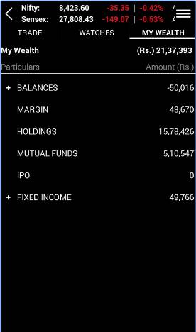 - The mobile app allows you to access the shown functionalities (in the menu) with provision to invest and trade across Equity, Currency, Mutual funds, IPOs, Bonds. Users can also make fund transfers between trading and bank accounts using the mobile app itself.