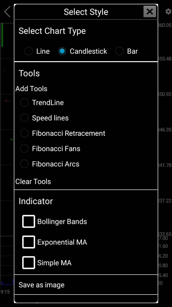 - At the same time, there are different types of charting styles including line chart, candlestick and bar charts. You can also add different tools and indicators. However, the functionality of these features is not great and overall charting experience stays pretty bland.