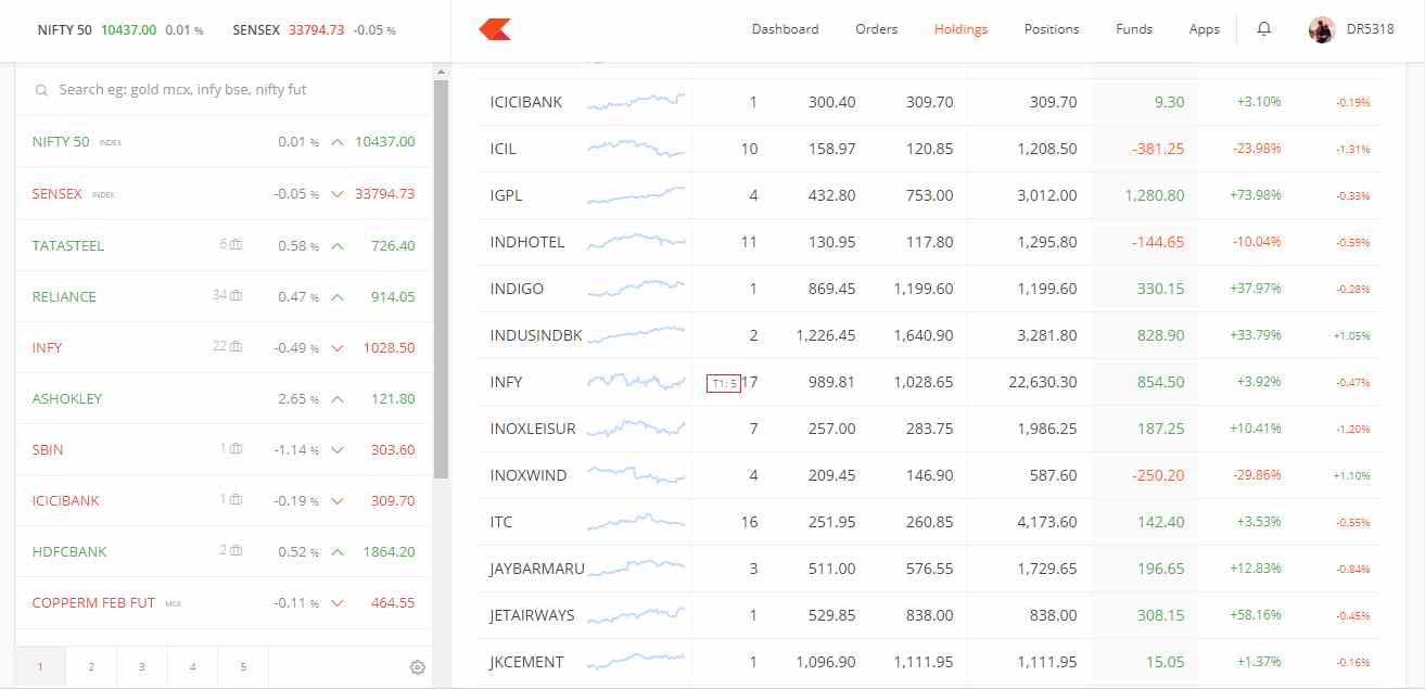 Up to 5 Market watch lists with 40 scrips allowed in each market watch list. Although, this is a generic feature and is available in most of the trading applications, however, Zerodha Kite Market watch feature is reasonably easy to use.