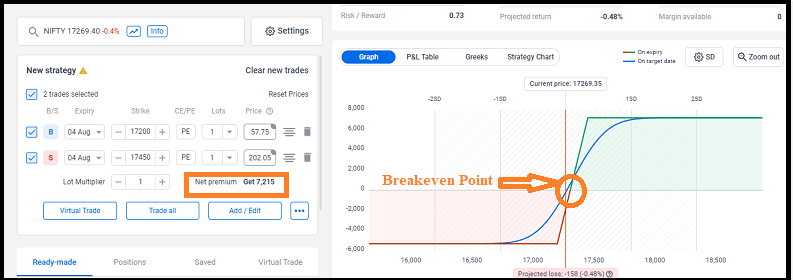 Here let’s say the premium you are paying to buy a call option is ₹100 and for a selling call position, you receive a premium of ₹110. Here the difference in the premium value is your profit at the beginning of trade.