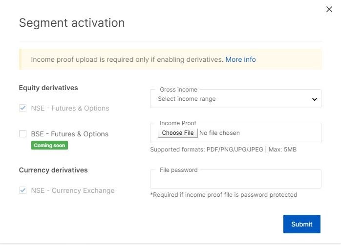 • You will now have to enter your gross income and also upload proof for the same.  (this is mandatory to activate the derivatives segment)