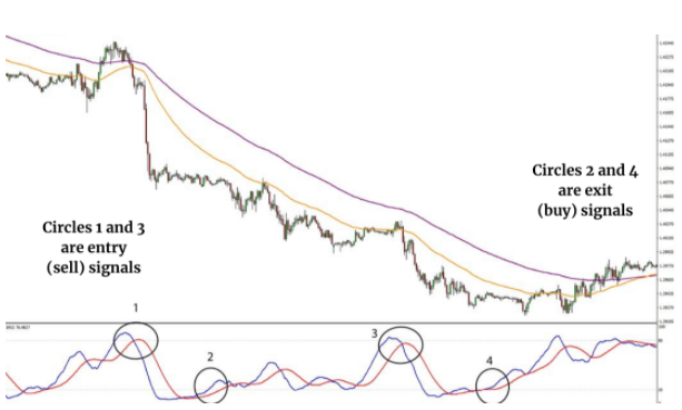 • The exit signal for short traders is when the blue line of the Stochastic indicator crosses the red line from the inside of the overbought region, and the exit signal for long traders is when the same happens in an oversold area.