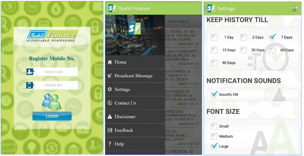 सुशील फाइनेंस सभी उपकरणों में ट्रेडिंग प्लेटफॉर्म प्रदान करते हैं अर्थात डेस्कटॉप, वेब और मोबाइल और ग्राहक अपनी प्राथमिकताओं के आधार पर ट्रेडिंग प्लेटफॉर्म का उपयोग कर सकते हैं यहाँ विवरण हैं: