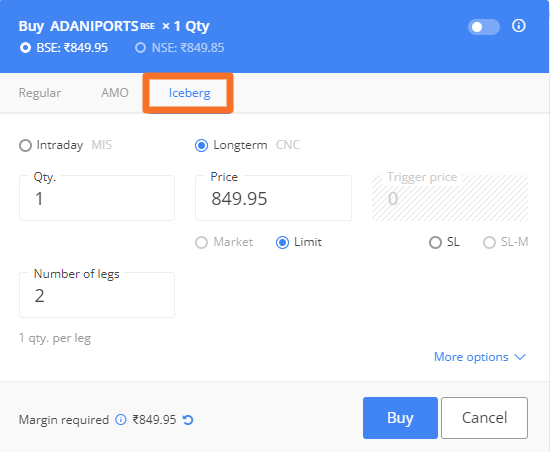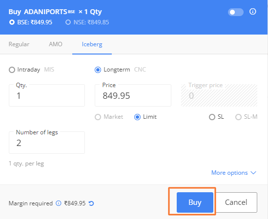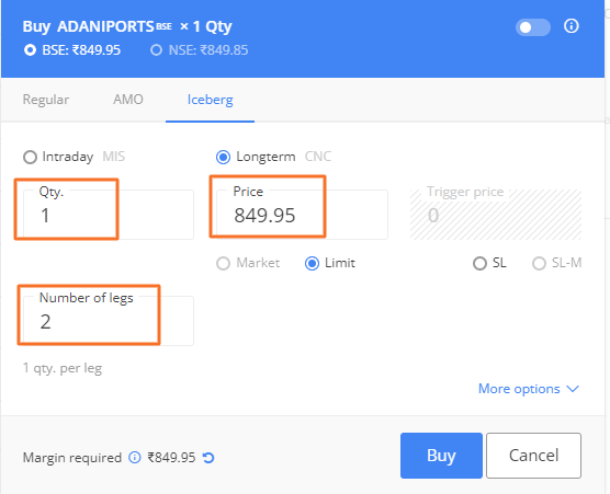 • When you place an iceberg order, each leg is treated as a different order. This means that you will be charged the brokerage according to every leg. For example, the charges for intraday are ₹20/executed order and you placed 5 legs, then the brokerage on on side of the trade will be ₹100.