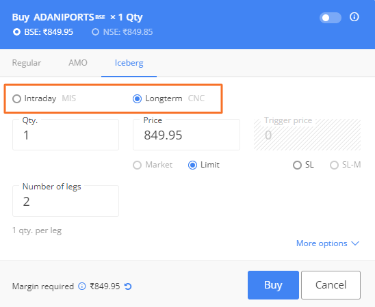 • You can place an iceberg order for intraday and delivery trading both. Select one from either of the options.